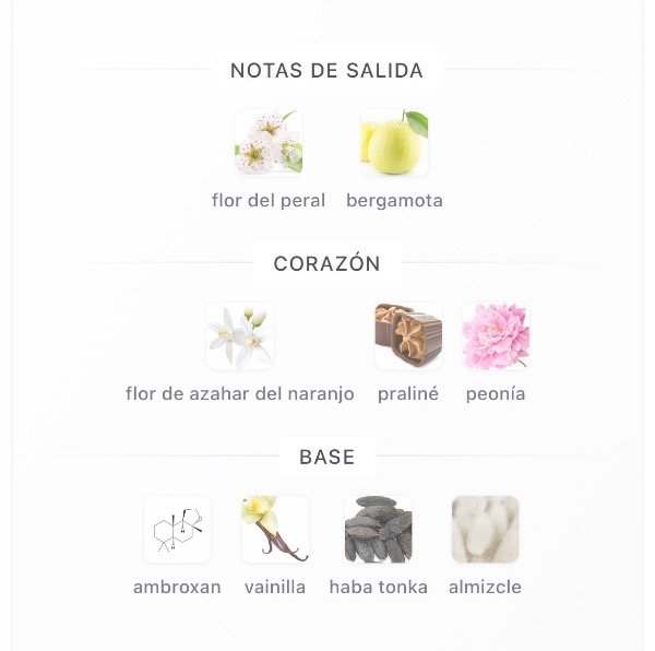 Notas Salida flor del peral y bergamota; Corazón flor de azahar del naranjo, praliné y peonía; Fondo ambroxan, vainilla, haba tonka y almizcle.
