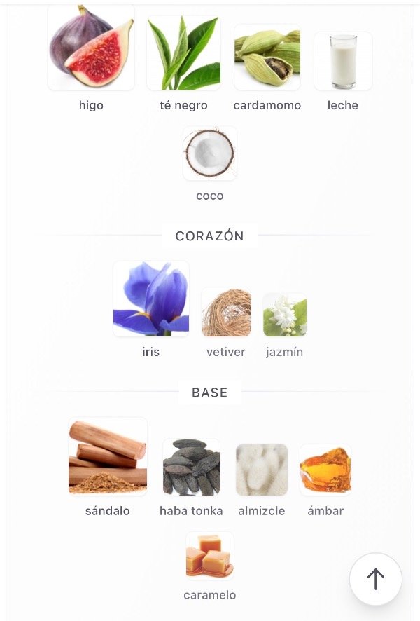 Notas Salida higo, té negro, cardamomo, leche y coco; Corazón iris, vetiver y jazmín; Fondo sándalo, haba tonka, almizcle, ámbar y caramelo.