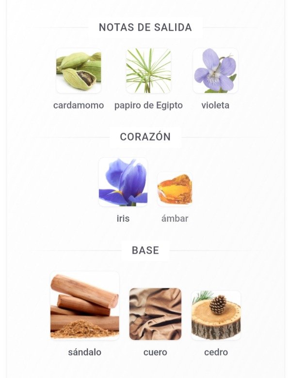 Notas Salida cardamomo, papiro de Egipto y violeta; Corazón iris y ámbar; Fondo sándalo, cuero y cedro.