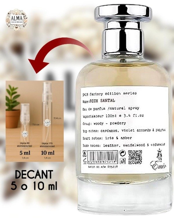 El dupe más cercano al famoso, delicioso y codiciado Santal 33 de Le Labo. Sándalo cremoso, seco y elegante, con un toque especiado y un fondo suave, tipo cuero. Amaderado y ligeramente atalcado, limpio y sofisticado. Un nicho total, elegante, minimalista y moderno para mujeres u hombres que amen este estilo y no quieran pasar desapercibidos.