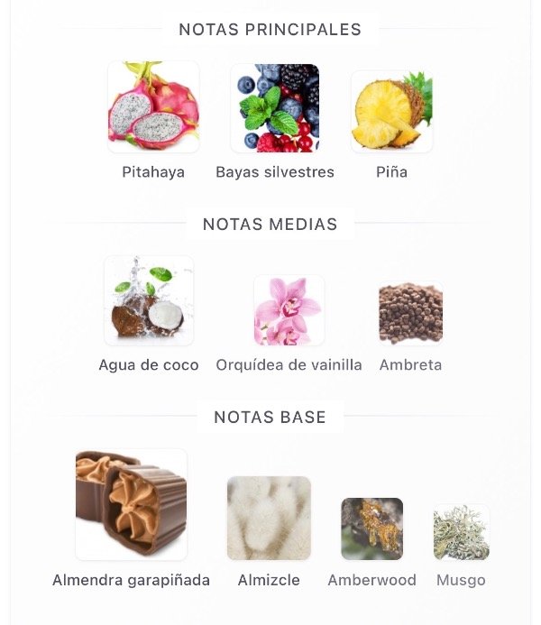 Notas pitahaya, bayas silvestres, piña, agua de coco, orquídea de vainilla, ambreta, praliné, almizcle, madera de ámbar y musgo.