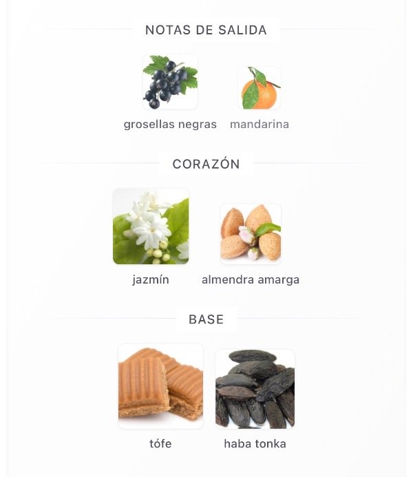 corazón jazmín y almendra amarga; Fondo tófe y haba tonka.