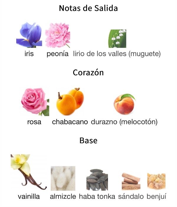 Notas Salida iris, peonía y lirio de los valles (muguete); Corazón rosa, chabacano y durazno; Fondo vainilla, almizcle, haba tonka, sándalo y benjuí.
