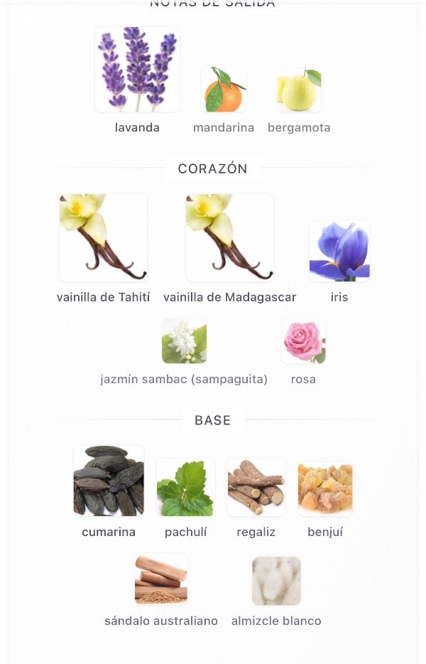 Notas Salida lavanda, mandarina y bergamota; Corazón vainilla de Tahití, vainilla de Madagascar, iris, jazmín sambac y rosa; Fondo cumarina, pachulí, regaliz, benjuí, sándalo australiano y almizcle blanco.