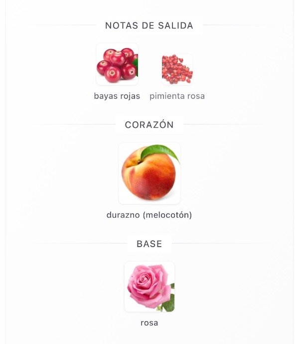 Durazno, bayas brillantes y rosas suaves. El durazno es realista pero no empalagoso y da una sensación jugosa y brillante. La rosa no es pesada ni intensa, sino más bien acogedora y aterciopelada, equilibrando el dulzor frutal.