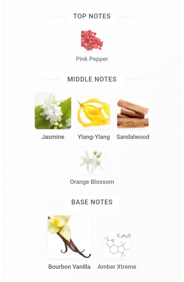 Notas salida pimienta rosa; corazón jazmín, ylang-ylang, sándalo y flor de naranjo; fondo vainilla Bourbon y ámbar extremo.