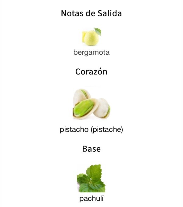 En su salida es fresco y lluminoso, luego pasa al pistacho usado como fruto moderno y elegante con un toque tostado y acaramelado. En el fondo se vuelve cálido con un dulzor suave y un poco amaderado que persiste en la piel.