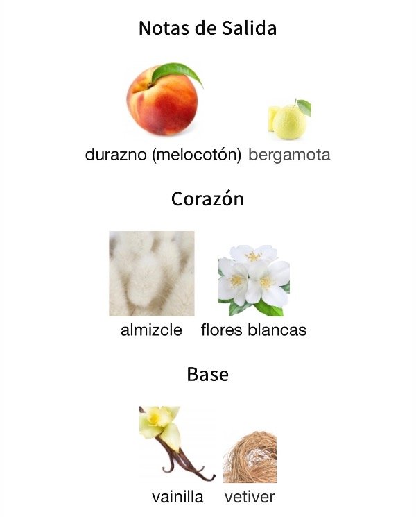 Notas Salida durazno y bergamota. Corazón almizcle y flores blancas. Fondo vainilla y vetiver.