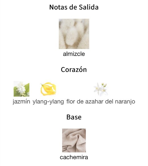 Notas almizcle, ylang ylang, jazmín, flor de azahar del naranjo y cachemira.