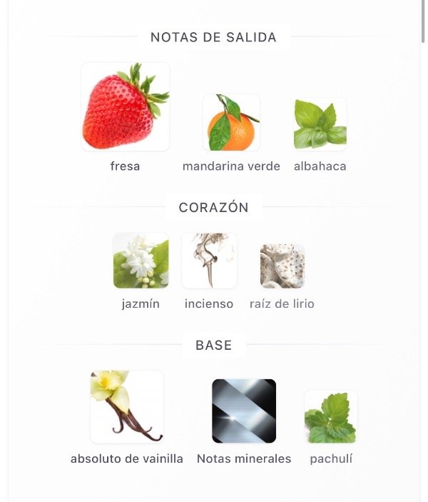 Notas Salida fresa, mandarina verde y albahaca; Corazón jazmín, incienso y raíz de lirio; Fondo absoluto de vainilla, Notas minerales y pachulí.