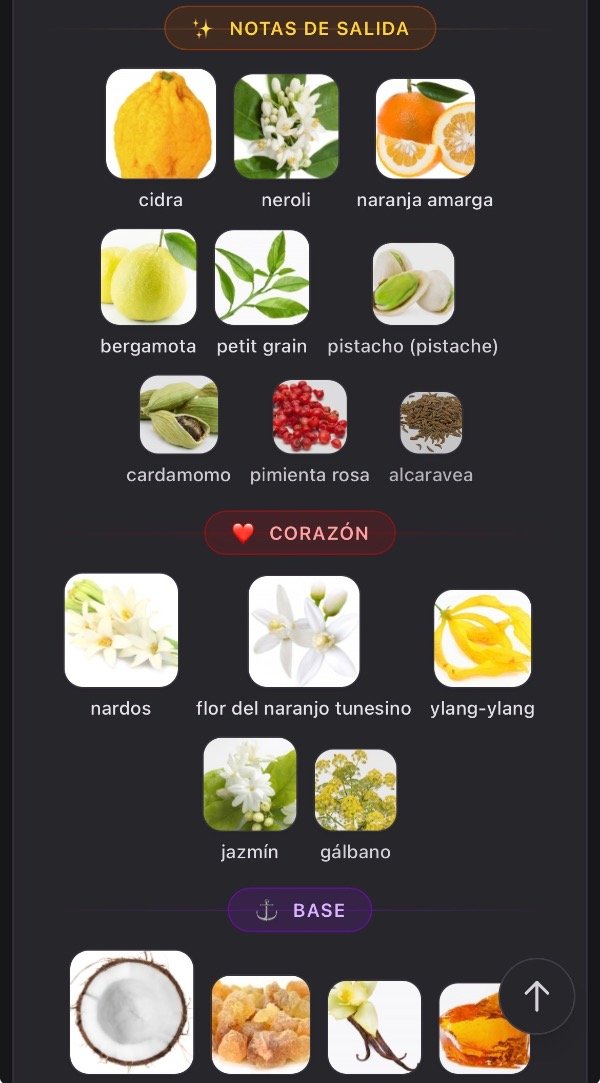 Notas Salida: naranja amarga, neroli, bergamota, cidra, pistacho, petitgrain, cardamomo, pimienta rosa y alcaravea.