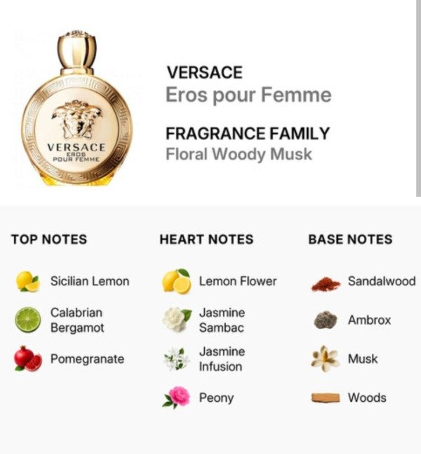 Notas salida limón siciliano, granada y bergamota de Calabria; corazón flor de limón, jazmín sambac, jazmín y peonía; fondo almizcle, ambroxan, notas amaderadas y sándalo.
