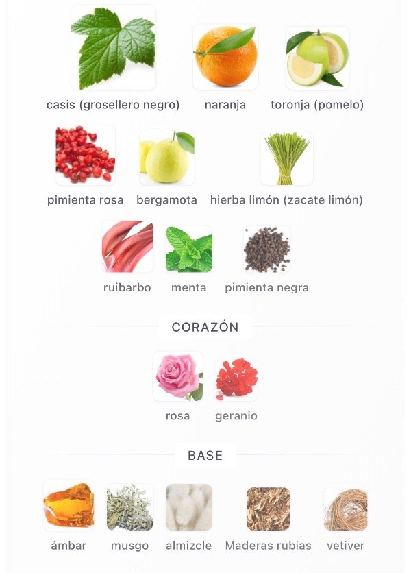 notas Salida casis (grosellero negro), naranja, pomelo, pimienta rosa, bergamota, hierba limón, ruibarbo, menta y pimienta negra; Corazón rosa y geranio; Fondo ámbar, musgo, almizcle, Maderas rubias y vetiver.