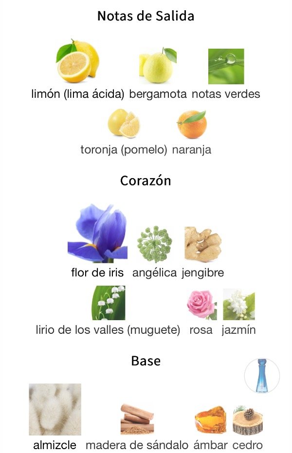 Notas salida: limón, bergamota, notas verdes, pomelo y naranja. corazón: flor de iris, angélica, jengibre, lirio de los valles (muguete), rosa y jazmín