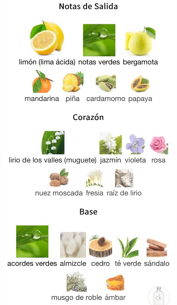 Notas Salida limón (lima ácida), notas verdes, bergamota, mandarina, piña, cardamomo y papaya; corazón lirio de los valles (muguete), jazmín, violeta, rosa, nuez moscada, fresia y raíz de lirio; fondo acordes verdes, almizcle, cedro, té verde, sándalo, musgo de roble y ámbar.