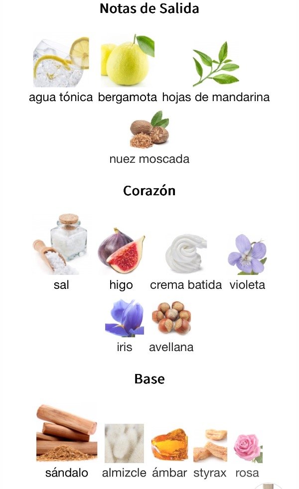 Las Notas de Salida son agua tónica, bergamota, hojas de mandarina y nuez moscada; las Notas de Corazón son sal, higo, crema batida, violeta, iris y avellana; las Notas de Fondo son sándalo, almizcle, ámbar, styrax y rosa.