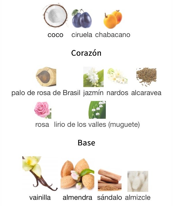 corazón: jazmín, tuberosa, rosa, lirio de los valles, alcaravea, palo de rosa brasileño