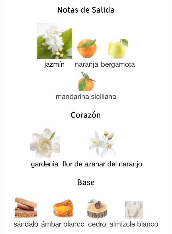 Notas Las Notas de Salida son jazmín, naranja, bergamota y mandarina siciliana; las Notas de Corazón son gardenia y flor de azahar del naranjo; las Notas de Fondo son sándalo, ámbar blanco, cedro y almizcle blanco.