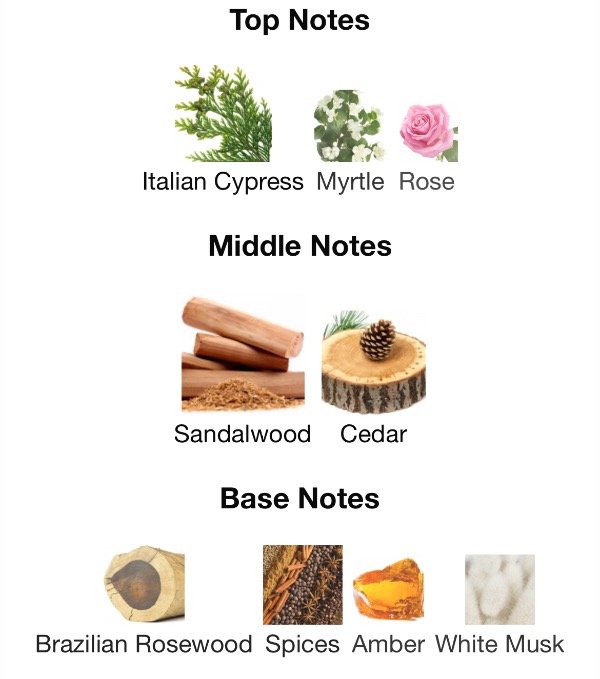 Notas: ciprés italiano, mirto, rosa, sándalo, cedro, palo rosa, especias, ámbar y almizcle blanco.