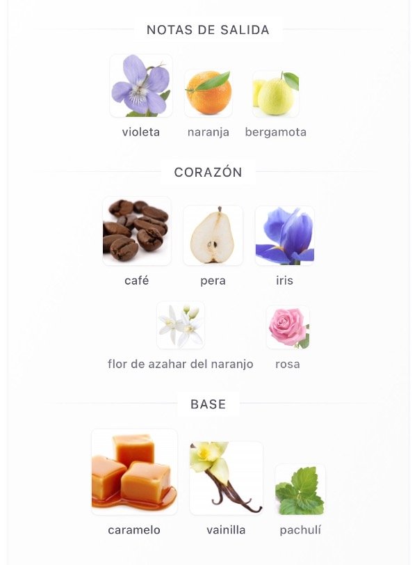 Notas Salida violeta, naranja y bergamota; Corazón café, pera, iris, flor de azahar del naranjo y rosa; Fondo caramelo, vainilla y pachulí.
