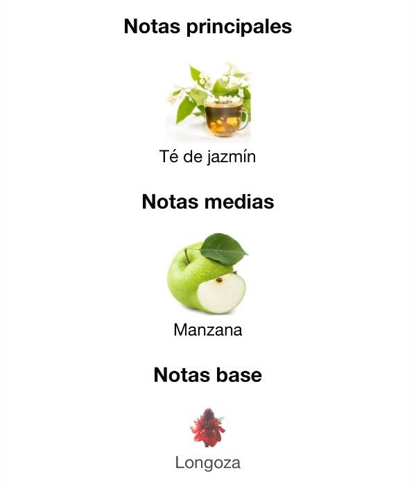 Notas de Salida: Té del jazmín; de Corazón: manzana; de Fondo: Longoza.