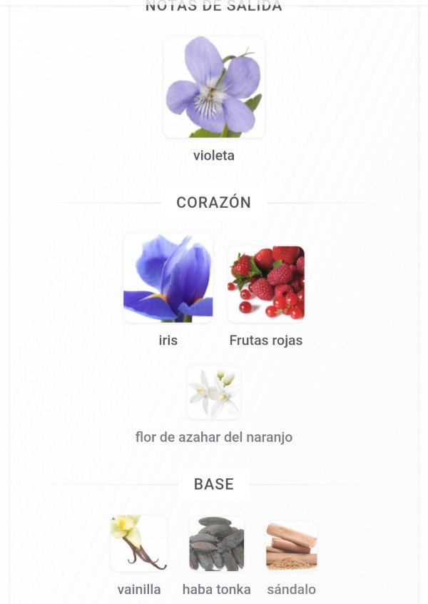 Notas Salida violeta; Corazón iris, Frutas rojas y flor de azahar del naranjo; Fondo vainilla, haba tonka y sándalo.