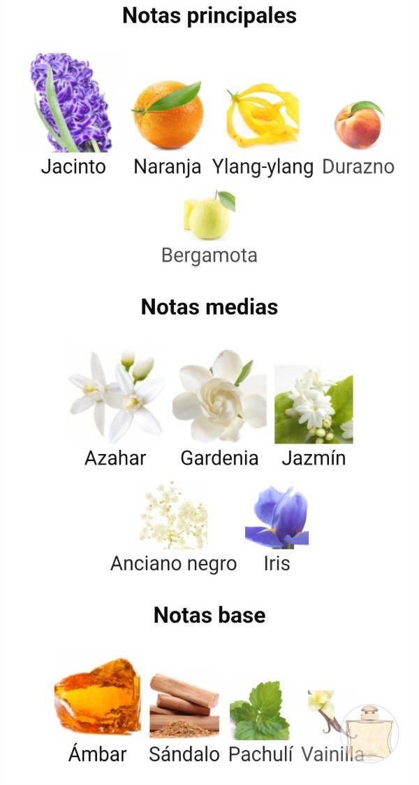 notas de salida jacinto, naranja, ylang-ylang, melocotón y bergamota; de corazón flor de azahar, gardenia, jazmín, saúco negro e iris; de fondo ámbar, sándalo, pachulí y vainilla.