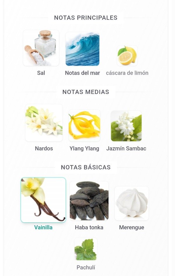 Notas salida sal, notas marinas y cáscara de limón; corazón nardo, ylang-ylang y jazmín sambac; fondo vainilla, haba tonka, merengue y pachulí.