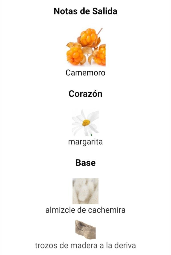 Notas Salida Camemoro (cloudberry, una baya ártica similar a una frambuesa amarilla). Corazón Margarita. Fondo Cachemira y Madera a la deriva.