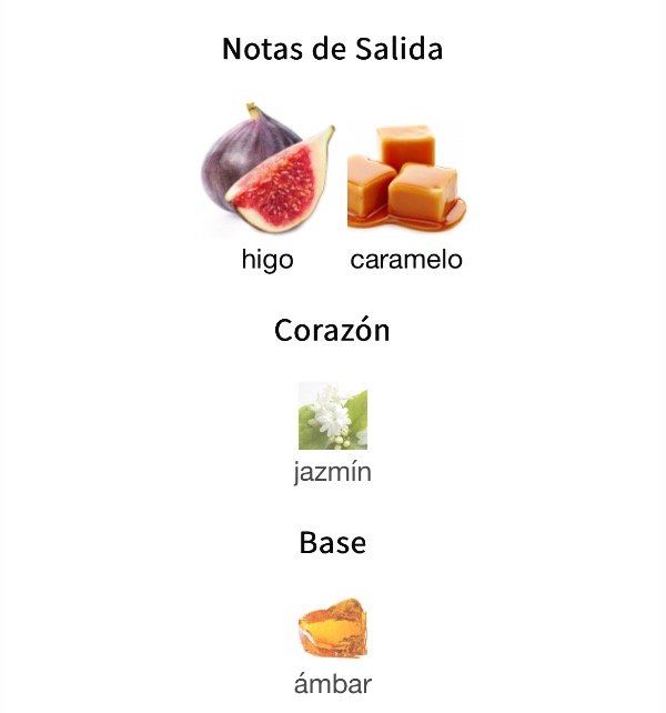 Las Notas de Salida son higo y caramelo; la Nota de Corazón es jazmín; la Nota de Fondo es ámbar.