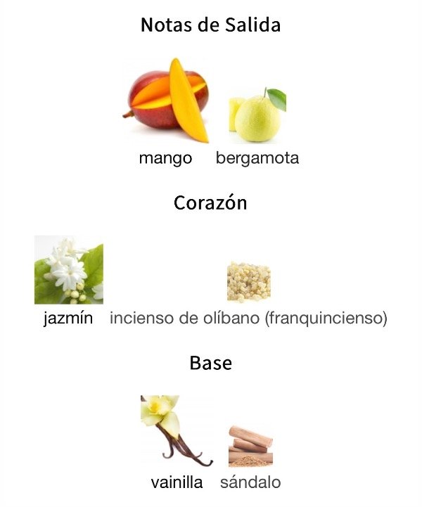 Salida mango y bergamota; Corazón jazmín e incienso de olíbano (franquincienso); Fondo vainilla y sándalo.