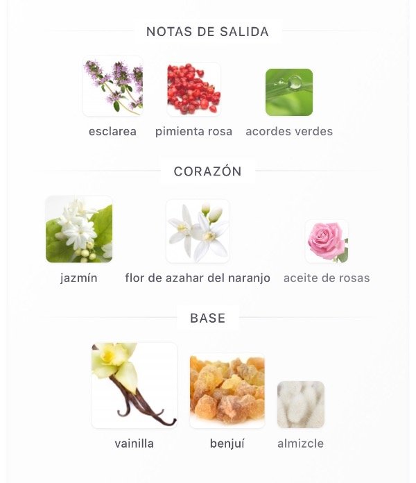 Notas Salida esclarea, pimienta rosa y acordes verdes; Corazón jazmín, flor de azahar del naranjo y aceite de rosas; Fondo vainilla, benjuí y almizcle.
