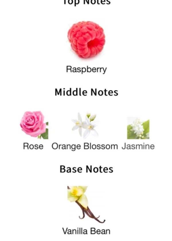 Notas: Salida frambuesa; Corazón rosa, flor de azahar del naranjo y jazmín; Fondo vaina de vainilla.