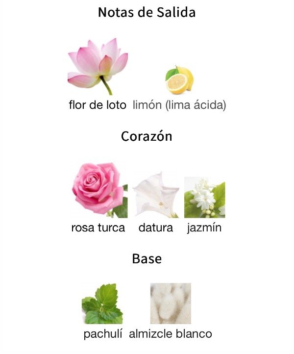 Notas: Lima, flor de datura, jazmín, loto blanco, pachulí, almizcle blanco.