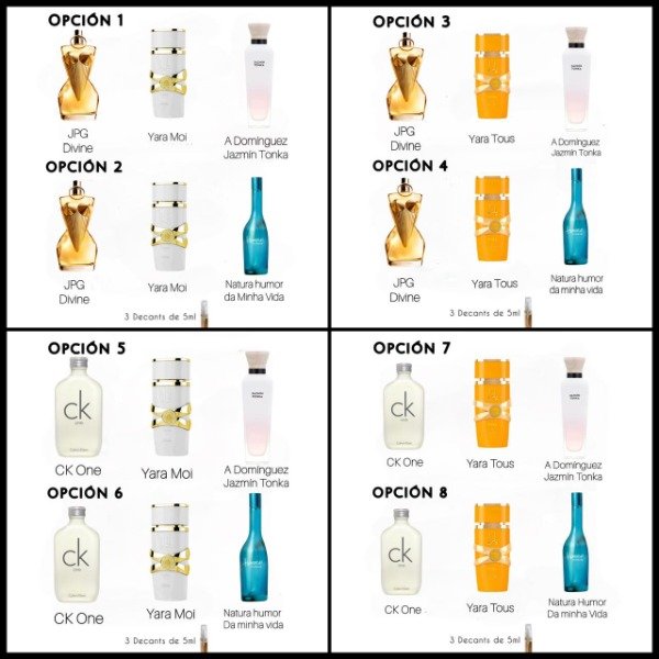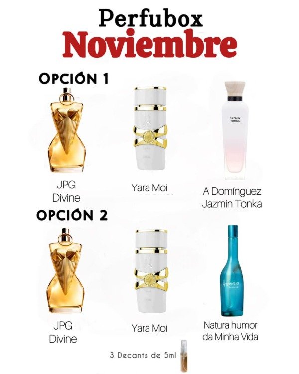 Cada caja contiene tres decants de 5 ml + muestra de regalo.