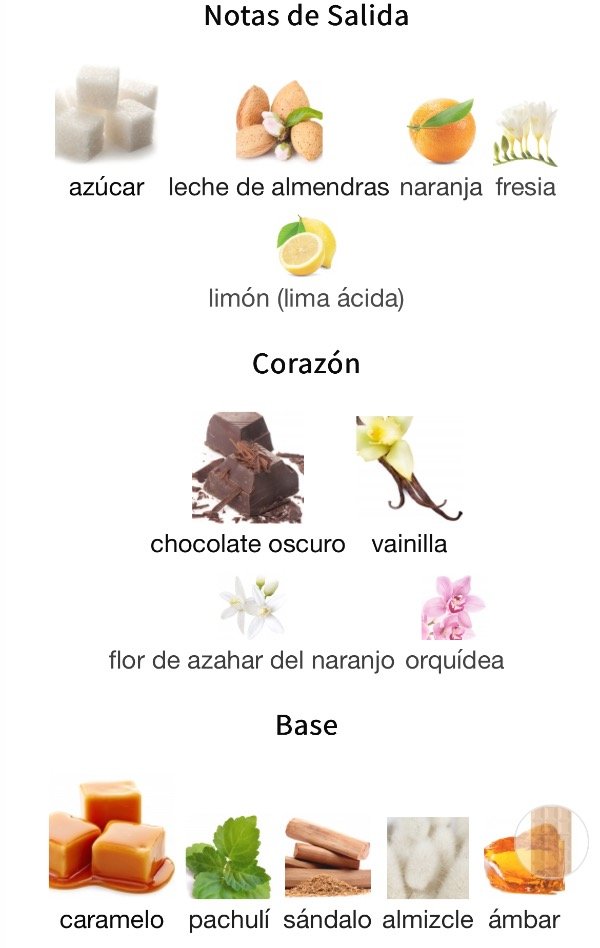 Las Notas de Salida son azúcar, leche de almendras, naranja, fresia y limón (lima ácida); las Notas de Corazón son chocolate oscuro, vainilla, flor de azahar del naranjo y orquídea; las Notas de Fondo son caramelo, pachulí, sándalo, almizcle y ámbar.