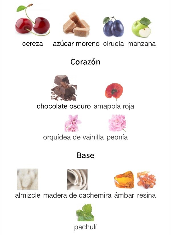 Las Notas de Salida son cereza, azúcar moreno, ciruela y manzana; las Notas de Corazón son chocolate oscuro, amapola roja, orquídea de vainilla y peonía; las Notas de Fondo son almizcle, madera de cachemira, ámbar, resina y pachulí.
